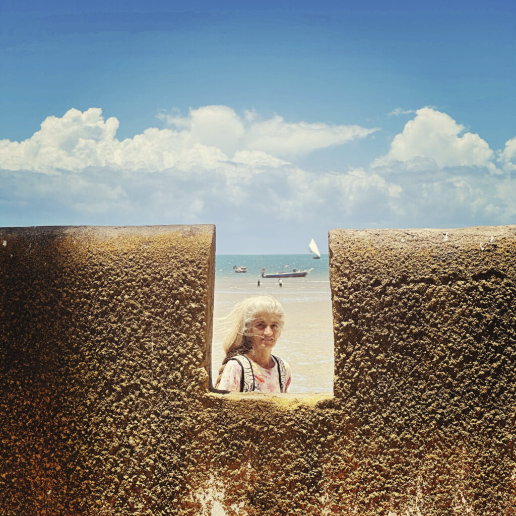 Nach einem Wocheneinkauf, fahren wir manchmal noch kurz runter an den Strand, um die Meerbrise und frische Luft zu geniessen. Einfach nur sein und dem Geschehen zuzuschauen. Hedli (Ursula) hinter einer alten Mauer am Strand.