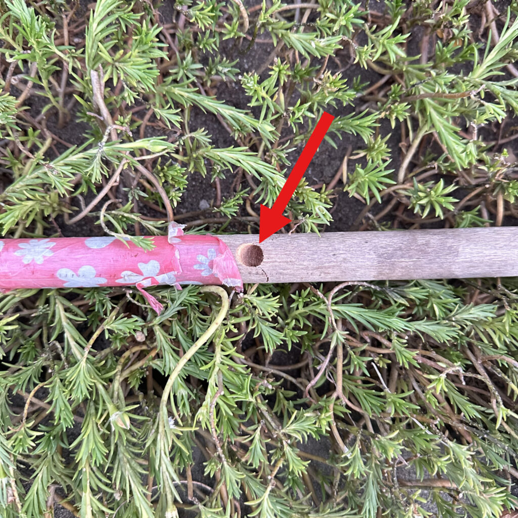 Leider störte ich mit meiner Arbeit sein Zuhause, so dass er einfach mal nach aussen in meinen vor dem Hauseingang platzierten Finger seinen Stachel bohrte. Nach Klopfversuchen, den ungebetenen Gast heraus zu schütteln, zerbrach der ganze Stiel, welcher durch das gebohrte Loch dieser Hummel, kaum noch eine Festigkeit bot.