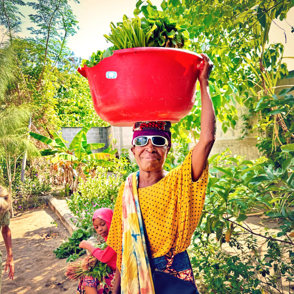 Sie stemmt und transportiert den Gemüsebottich mit geschätzten 15-20 Kg Gewicht auf bewundernswerte Weise durch die Gegend zu ihrer Kundschaft. Immer wieder fragen wir uns, woher diese Frau die notwendige Kraft hernimmt.