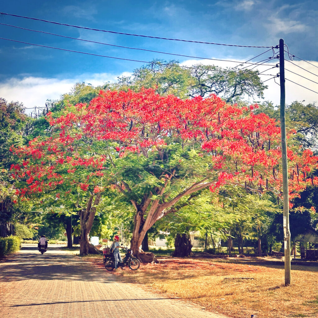 Im Anschluss noch ein kurzer Abstecher runter zum Hafen, dort blühen jetzt die wunderbar leuchtenden „Weihnachtsbäume“. Bevor wir wieder nach Hause fahren, gönnen wir uns diese Blütenpracht. Leider gibt es nicht mehr viele dieser wundervollen Bäume. Generell werden Bäume eher abgeholzt als neu gepflanzt, etwas was wir nicht begreifen. Schattenspender scheinen aus nicht erkennbaren Gründen für einen anderen Zweck verwendet, wir vermuten Brennholz, denn noch immer kochen die meisten Menschen mit Kohle und Holz. Wir wünschen uns für diese Menschen hier ein Wandel, nicht nur im Bewusstsein zu ihrer Umwelt, wer weiss, vielleicht kommt dies eines Tages. Schlussendlich steht die Überlebensfrage vor der Erhaltung von Bäumen, so ist es nun mal, leider.