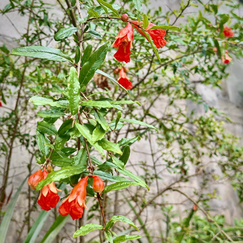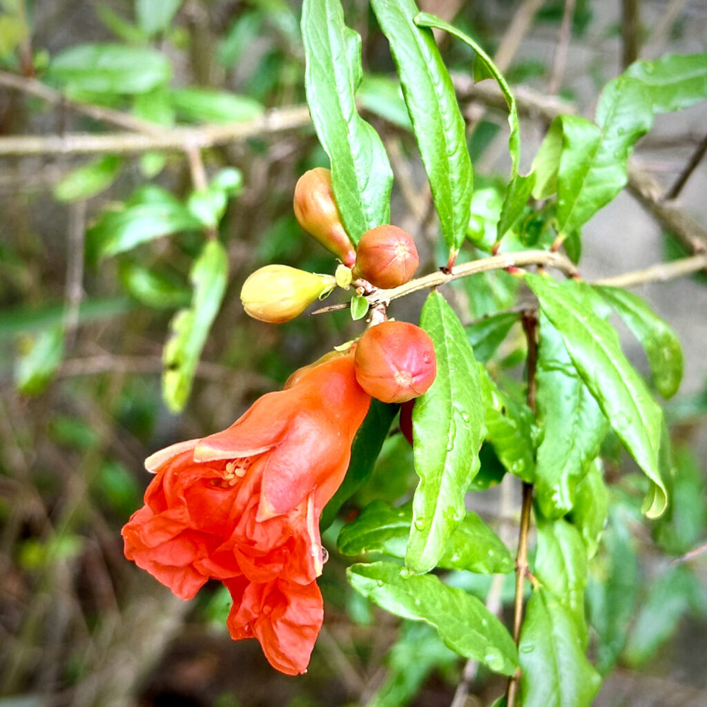 Auch die gepflanzten Granatapfel Sträucher blühen wie verrückt, obwohl diese die Früchte wahrscheinlich wieder abstossen werden, mal sehen was passiert.