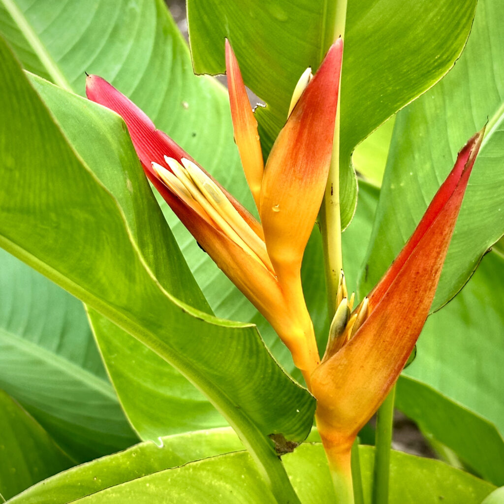 Zum ersten mal zeigen sich Blüten in den Strelizia Pflanzen, Paradiesvogel Pflanze mit ihren eigentümlichen Blüten. Lange hat es gedauert. Mit zwei Blättern haben wir die erste Pflanze gesetzt, nun hat sie sich bereits selbst im Boden vermehrt und treibt die erste Blüte aus.